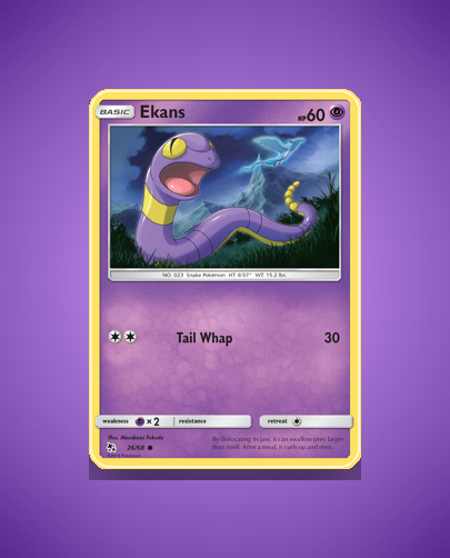 Ekans is a Common card from the Hidden Fates set, numbered 26. With 60 HP and a single attack—Tail Whap—it’s a straightforward, no-frills addition to a collection or casual deck.