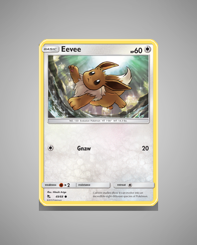 Eevee from the Hidden Fates set is a common card numbered 49 with 60 HP. This charming Pokémon features the straightforward attack Gnaw. Its simple design makes it a recognizable addition to any collection.