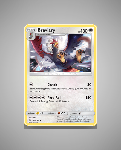 - Cosmic Eclipse (sm12): This set features Braviary as a Stage 1 Colorless-type Pokémon with strong attacks and a distinctive flavor text highlighting its heroic scars. The set is part of the Sun & Moon series, known for its diverse and colorful Pokémon roster.
