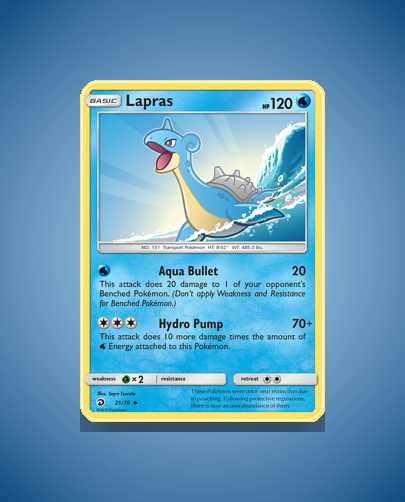 • Hydro Pump, which does 70+ damage plus an additional 10 damage for each Water Energy attached to Lapras.
