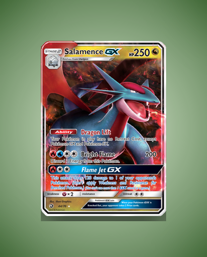 • Dragon Majesty (sm75): Salamence-GX appears as a powerful Dragon-type Stage 2 GX card with a unique ability to reduce retreat costs for most of your Pokémon. Its high HP and strong attacks make it a notable inclusion in this set.