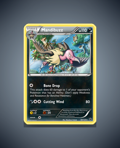 Mandibuzz from the Fates Collide set is a Rare card numbered 58 with 110 HP. This Pokémon features the attack Cutting Wind, offering strategic options in battle. Its sturdy presence makes it a notable addition to any collection.