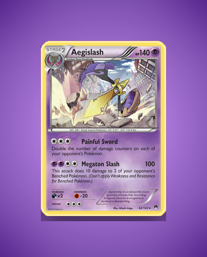 - BREAKpoint (xy9): This set includes the Aegislash card as a Rare Holo, emphasizing powerful Stage 2 Pokémon with dynamic attacks and strategic play potential. The set’s artwork and card design reflect the evolving complexity of the XY series.