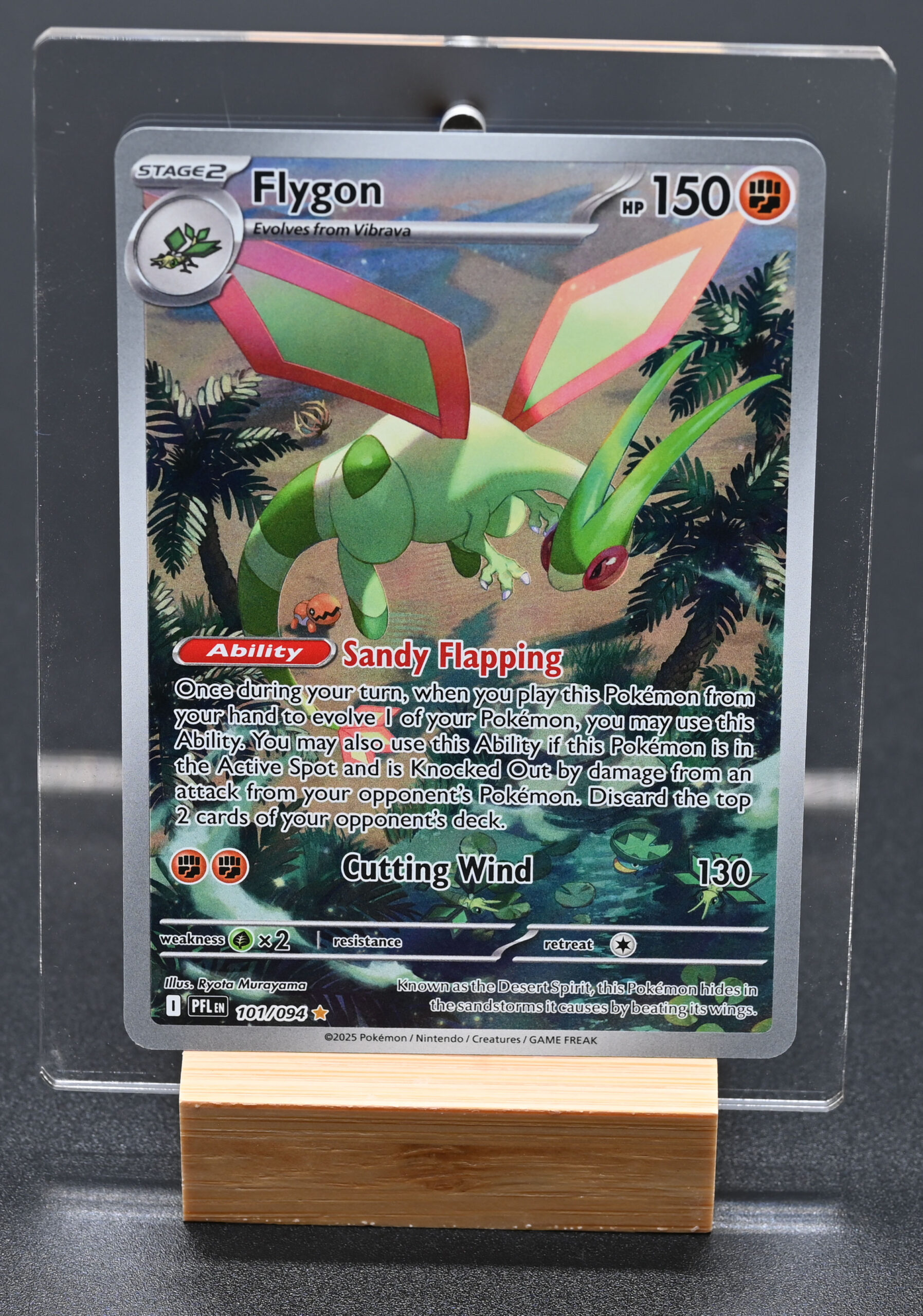 The Mega Evolutions: Phantasmal Flames expansion mixes supernatural colors with fiery atmosphere — and few cards blend those themes better than Flygon 101/094, a Full Art Rare featuring the desert dragon in a beautifully stylized environment.