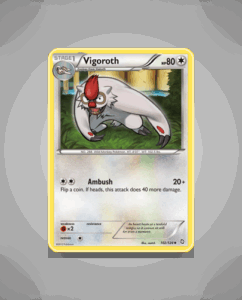Vigoroth from the Dragons Exalted set is an uncommon card numbered 102. It has 80 HP and features the attack Ambush. This energetic Pokémon adds a dynamic presence to any deck.