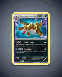 Krookodile from the Dragons Exalted set is a Rare Secret card numbered 127. This powerful Pokémon boasts 150 HP and features the striking attack Dark Clamp. Its design captures a fierce presence, making it a notable addition to any collection.