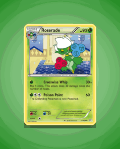 Roserade from the Dragons Exalted set is an uncommon card numbered 14. It features 90 HP and a distinctive attack called Poison Point. This vibrant Pokémon adds strategic value to any collection with its unique abilities.
