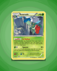 Roserade from the Dragons Exalted set is a Rare card with 90 HP. It features the ability Le Parfum and the attack Squeeze. This elegant Pokémon is numbered 15 in the set.
