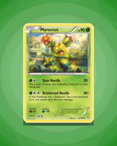 Maractus from the Dragons Exalted set is an uncommon Pokémon card numbered 16. It features 90 HP and a single attack called Reinforced Needle. This card offers a straightforward addition to any collection with its vibrant design.