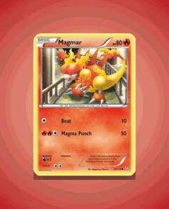 Magmar from the Dragons Exalted set is a common card numbered 20 with 80 HP. This fiery Pokémon features the attack Magma Punch, delivering a straightforward but effective strike. Its design captures the blazing spirit typical of Magmar.