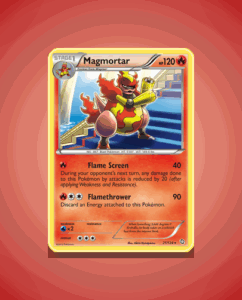 Magmortar from the Dragons Exalted set is a Rare card numbered 21, boasting 120 HP. This fiery Pokémon features the attack Flamethrower, showcasing its intense power in battle. Its vibrant design captures the essence of its blazing strength.