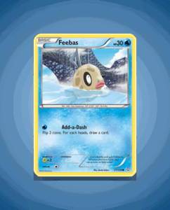 Feebas from the Dragons Exalted set is a common Pokémon card numbered 27. It has a modest 30 HP and features the attack Add-a-Dash. This simple design fits well within the set’s dynamic lineup.