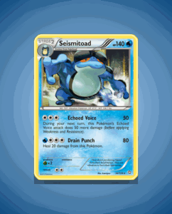 Seismitoad from the Dragons Exalted set is a Rare card numbered 36. It boasts a sturdy 140 HP and features the attack Drain Punch. This card offers solid presence in any collection with its vibrant design and reliable stats.