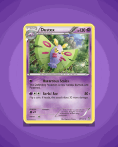 Dustox from the Dragons Exalted set is a rare card numbered 47. It boasts a solid 130 HP, making it a resilient choice in battle. Its attack, Aerial Ace, offers a straightforward offensive option for players.