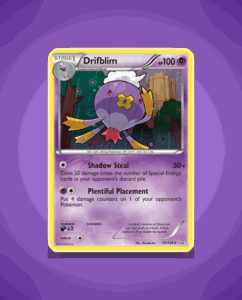 Drifblim from the Dragons Exalted set is a rare card numbered 51 with 100 HP. It features the distinctive attack Shadow Steal, adding strategic depth to gameplay. This card’s design captures Drifblim’s ghostly essence in a striking way.