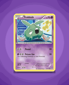 Trubbish from the Dragons Exalted set is a common card numbered 53 with 70 HP. This quirky Pokémon features the attack Poison Gas, adding a strategic element to gameplay. Its straightforward design makes it a notable pick for collectors of the set.