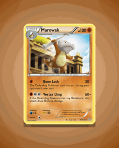 Marowak from the Dragons Exalted set is a rare card numbered 61 with 100 HP. This sturdy Pokémon features the attack Vortex Chop, showcasing its combat prowess. Its presence adds a distinctive edge to any collection.