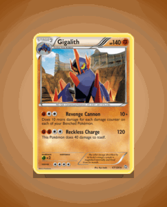Gigalith from the Dragons Exalted set is a Rare Holo card numbered 67. This sturdy Pokémon boasts 140 HP and features the dynamic attack Reckless Charge. Its presence adds a solid edge to any collection.