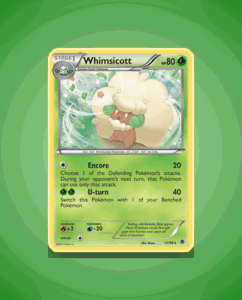 Whimsicott is a rare card from the Emerging Powers set, numbered 12. This charming Pokémon has 80 HP and features the attack U-turn. Its design captures a playful yet agile spirit, making it a notable addition for collectors.