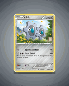 Klink is a Common Pokémon card from the Emerging Powers set, numbered 74. It has 60 HP and features the attack Gear Grind. This card offers a straightforward addition to any collection with its simple yet mechanical design.