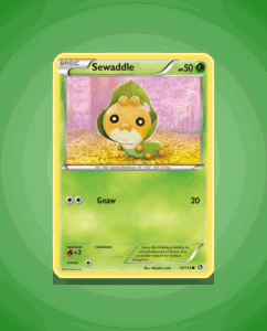 Sewaddle from the Legendary Treasures set is a Common Pokémon card featuring 50 HP. This card is numbered 10 and includes the attack Gnaw. Its straightforward design makes it an accessible addition for collectors.