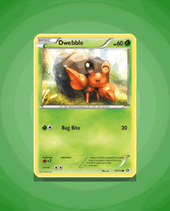Dwebble is a Common Pokémon card from the Legendary Treasures set, numbered 13. It has 60 HP and features the attack Bug Bite. This modest card offers a straightforward addition to any collection.