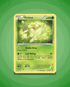 Virizion from the Legendary Treasures set is a Rare Holo card numbered 15. It boasts 110 HP and features the attack Leaf Wallop. This card offers a striking addition to any collection with its vivid design.