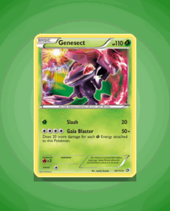 Genesect from the Legendary Treasures set is a Rare Holo card numbered 16. This sleek Pokémon boasts 110 HP and features the powerful attack Gaia Blaster. Its striking design makes it a notable addition to any collection.