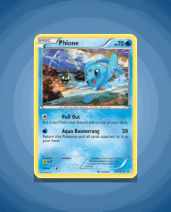 Phione from the Legendary Treasures set is a rare card numbered 36 with 70 HP. It features the distinctive attack Aqua Boomerang, adding a splash of strategy to gameplay. This card’s vibrant design makes it a notable addition for collectors.