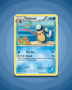 Palpitoad is an uncommon Pokémon card from the Legendary Treasures set, numbered 41. It features 80 HP and a single attack called Mud Shot. This card offers a straightforward addition to any collection.