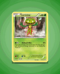 Carnivine from the Legendary Treasures set is an uncommon card with 80 HP. It features the attack Ambush Bite, adding a tactical edge to gameplay. This card is numbered 5 in the set, making it a distinctive addition for collectors.