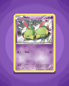 Natu from the Legendary Treasures set is a common card numbered 55. It has 50 HP and features the straightforward attack Peck. This card offers a simple yet charming addition to any collection.