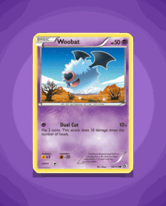 Woobat from the Legendary Treasures set is a common card numbered 64. It features 50 HP and a single attack called Dual Cut. This straightforward design makes it an accessible addition to any collection.