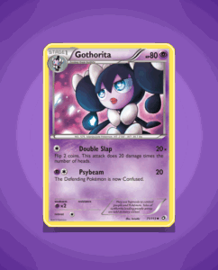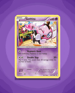 Gothita from the Legendary Treasures set is a common card numbered 70. This charming Pokémon has 50 HP and features the attack Trip Over. Its simple design makes it an accessible addition for collectors.