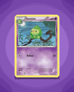 Duosion from the Legendary Treasures set is an uncommon card numbered 75. It features 60 HP and a single attack called Rollout. This card offers a straightforward addition to any collection with its clean design and modest stats.