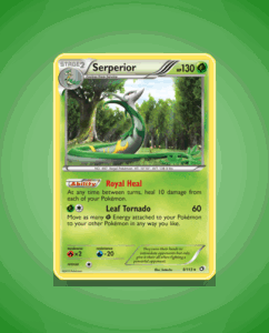 Serperior from the Legendary Treasures set is a Rare Holo card numbered 8 with 130 HP. It features the Royal Heal ability, offering strategic recovery options. Its attack, Leaf Tornado, provides a dynamic offensive move for battles.