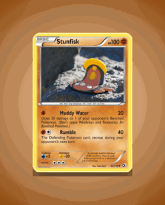 Stunfisk from the Legendary Treasures set is an Uncommon card numbered 83. This Pokémon boasts 100 HP and features the dynamic attack Rumble. Its sturdy presence makes it a notable addition to any collection.