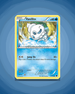 Vanillite from the Plasma Freeze set is a common card numbered 27. This frosty Pokémon has 60 HP and features the attack Jump On. Its simple design makes it a charming addition to any collection.