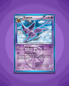 Espeon from the Plasma Freeze set is an uncommon card numbered 48. It features a sleek design with 90 HP, showcasing the Psychic-type’s agility. Its attack, Psy Alert, reflects Espeon’s keen mental prowess in battle.