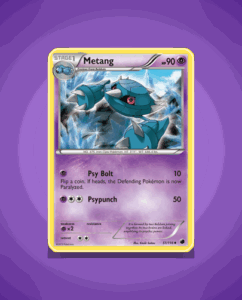 Metang is an Uncommon Pokémon card from the Plasma Freeze set, numbered 51. It features a solid 90 HP and a single attack called Psypunch. This card offers a straightforward yet engaging option for collectors and players alike.