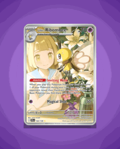 Lillie’s Ribombee from the Journey Together set is a charming Illustration Rare card, numbered 164. It boasts 70 HP and features the ability Inviting Wink, along with the attack Magical Shot. This card offers a delicate yet strategic addition to any collection.