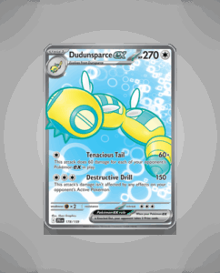 Dudunsparce ex from the Journey Together set is an Ultra Rare card numbered 178. This powerful Pokémon boasts 270 HP and features the striking attack Destructive Drill. Its bold presence makes it a notable addition for collectors seeking standout cards.