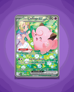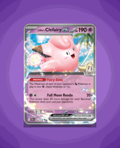 Lillie’s Clefairy ex from the Journey Together set is an Ultra Rare card boasting 190 HP. It features the unique ability Fairy Zone and the dynamic attack Full Moon Rondo. This card stands out with its vibrant design and strategic potential.