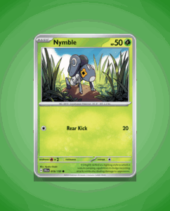 Nymble is a Common Pokémon card from the Journey Together set, numbered 19. It has a modest 50 HP and features the attack Rear Kick. This simple design fits well within the set’s vibrant lineup.
