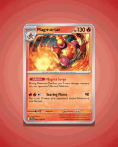 Magmortar from the Journey Together set is a Rare card numbered 21, boasting 130 HP. Its ability, Magma Surge, and the powerful attack Searing Flame make it a striking addition to any collection. This fiery Pokémon stands out with its bold design and strategic potential.