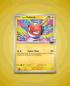 Iono’s Voltorb from the Journey Together set is a Common card numbered 47. It features 70 HP and a striking attack called Voltaic Chain. This energetic Pokémon adds a dynamic edge to any collection.
