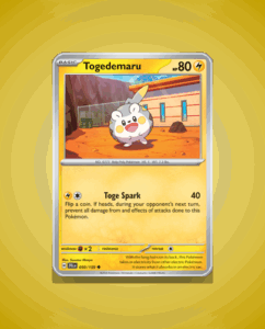 Togedemaru from the Journey Together set is a common card numbered 50 with 80 HP. This lively Pokémon features the attack Toge Spark, adding an energetic touch to any deck. Its straightforward design makes it a solid choice for collectors and players alike.