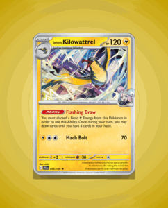 Iono’s Kilowattrel from the Journey Together set is a rare card numbered 55 with 120 HP. It features the ability Flashing Draw and the attack Mach Bolt. This card offers a dynamic addition to any collection.