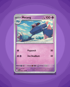 Metang is a Common Pokémon card from the Journey Together set, numbered 62. It has a solid 100 HP and features the attack Zen Headbutt. This card offers a straightforward addition to any collection.