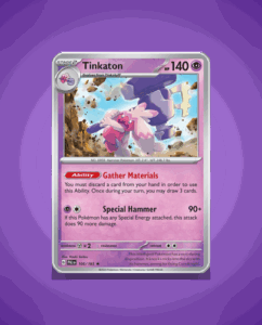 In the expansive Paldea Evolved set, the rare Tinkaton (#105) stands out with a robust HP of 140. This unique Pokémon boasts the ability to Gather Materials, a trait that sets it apart from its peers. Its formidable attack, Special Hammer, is sure to leave…